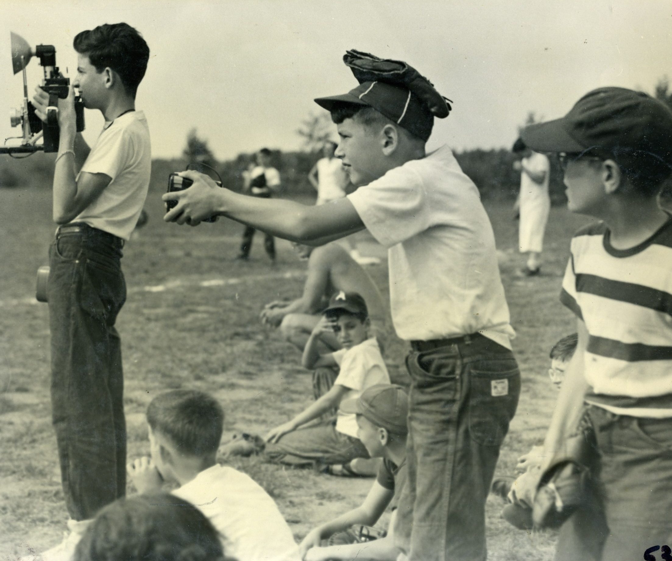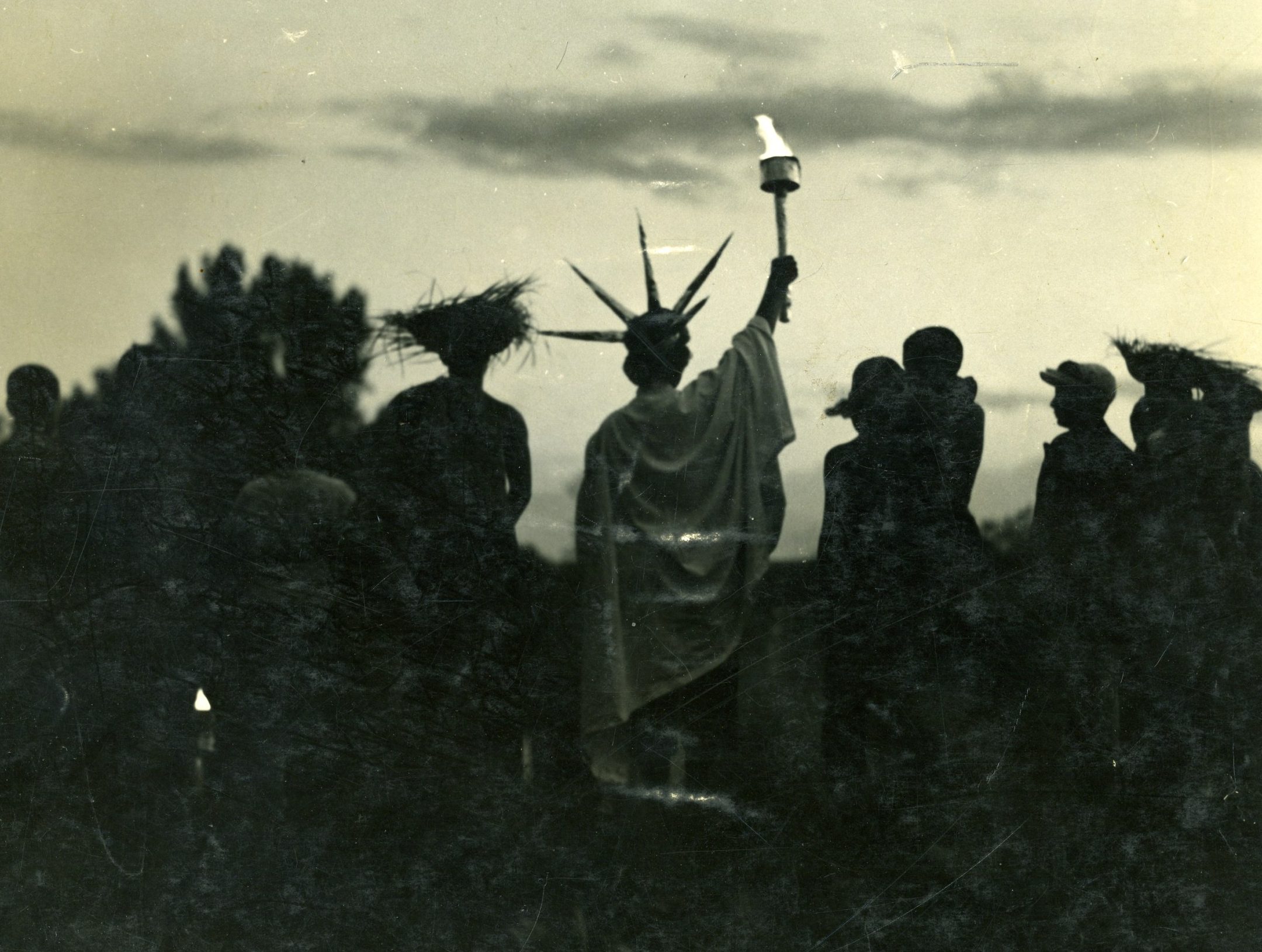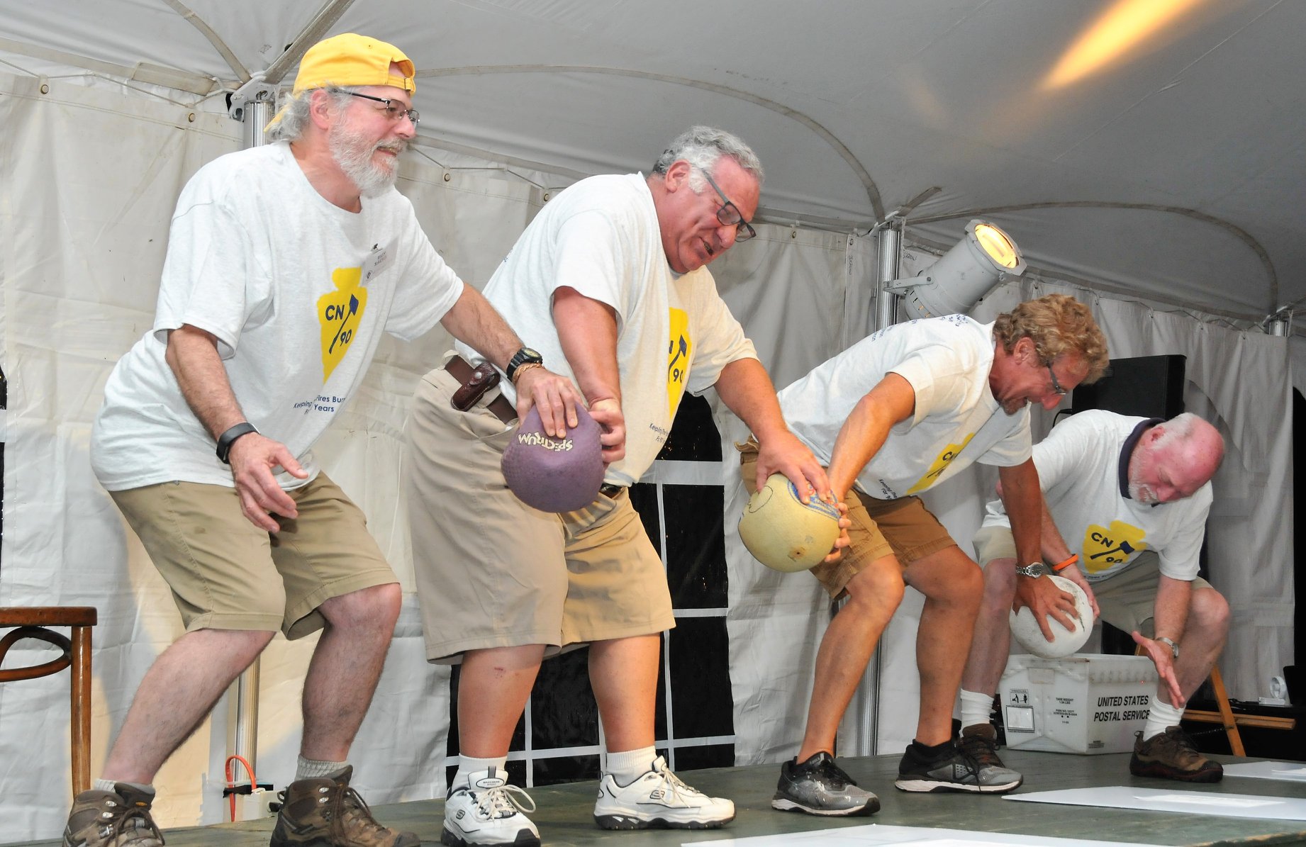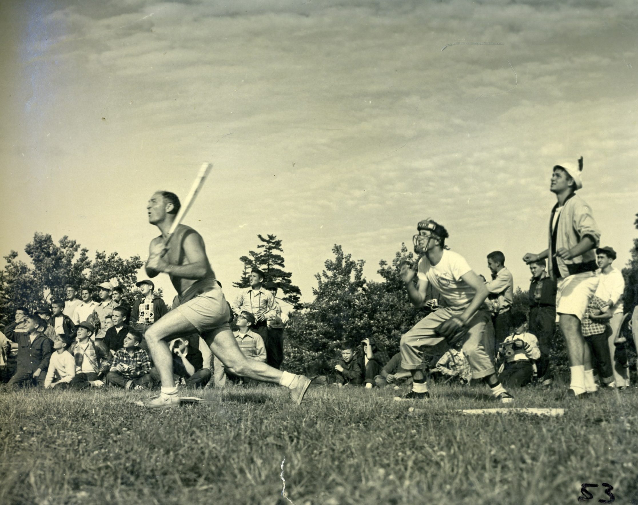 But sometimes the little things can be equally captivating and rather enlightening. Is that a cigar in the mouth of a tennis-playing staff member in 1935? A boxing match in 1945? A chalkboard, in 1959, where the Upper Diamond scoreboard now stands? The actual presentation of the Survival Big Trip poncho in 1964? Camp’s version of the Village People at the 1979 Follies? A toga on the Paul Bunyan statue in 1986? And, in 2004 at the all-camp birthday, four village directors holding cakes depicting… their four faces?
