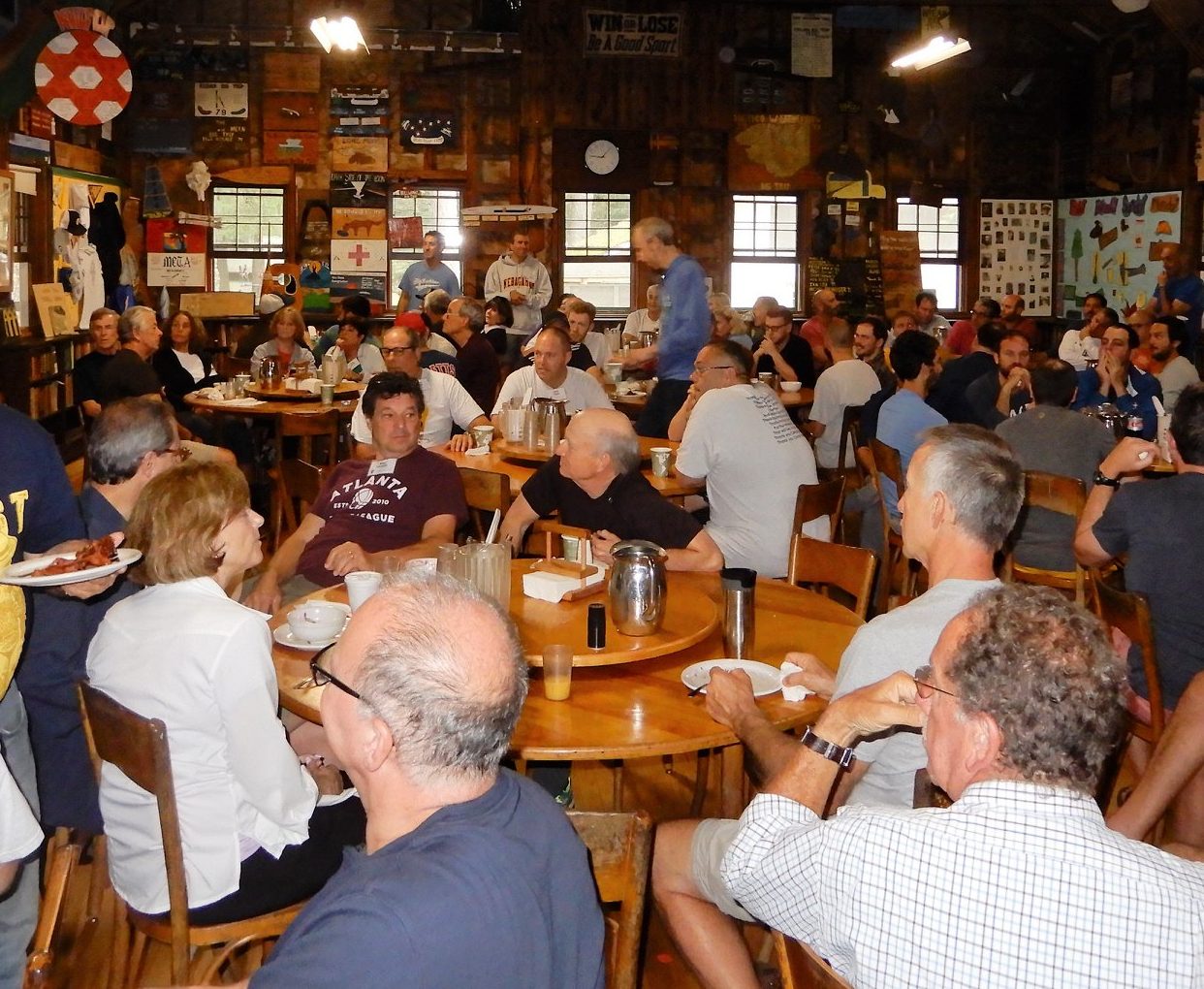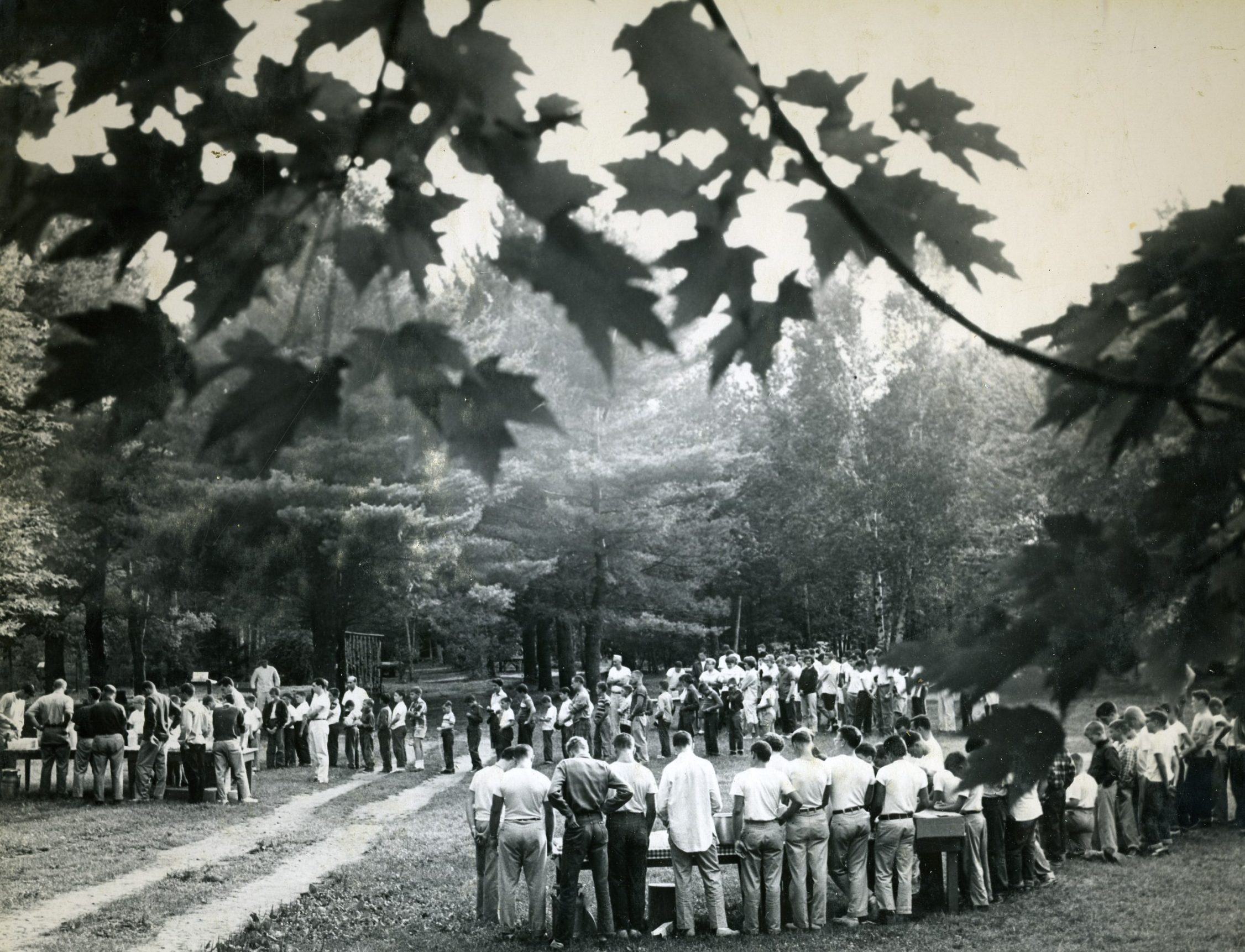 A stroll through the hundreds of photos shows camp’s evolution through the years. Stop on the spread about rowing, for instance, and you’ll see that the project once featured a version of paddle boats. Look closely at some Sunday photos, and you’ll notice that in camp’s earliest years the Council Fire Ring was essentially a theater-in-the-round. There are photos of the old Boathouse in 1933, the camp fire brigade in 1946, square dancing at the social in 1955, covered wagon trips, the Waterfront cabana, Cruiser Day bag lunches, and canvas tents that once constituted the Lumberjack Village.