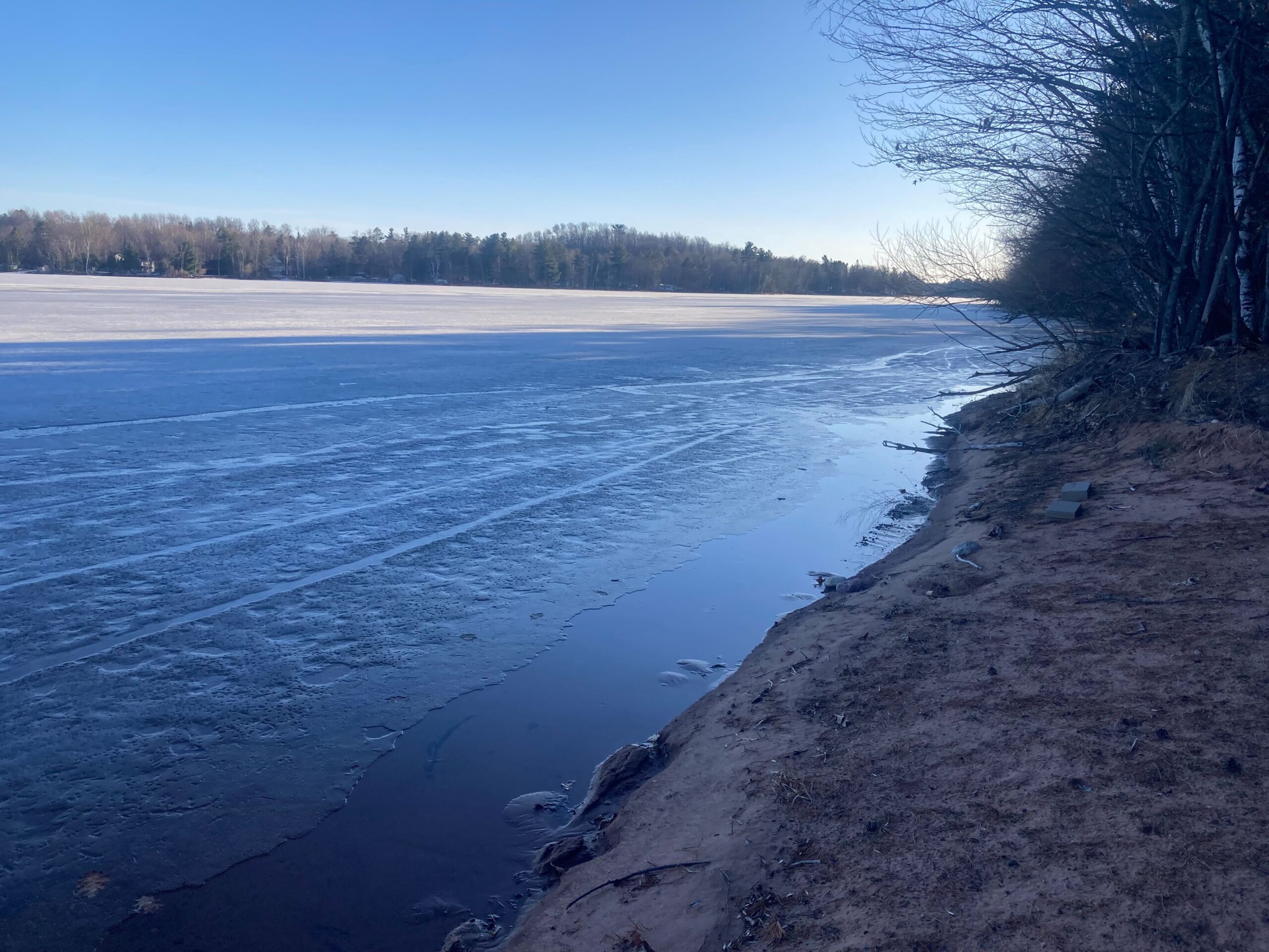 - Ice has melted from the shore and remains in the middle of the lake