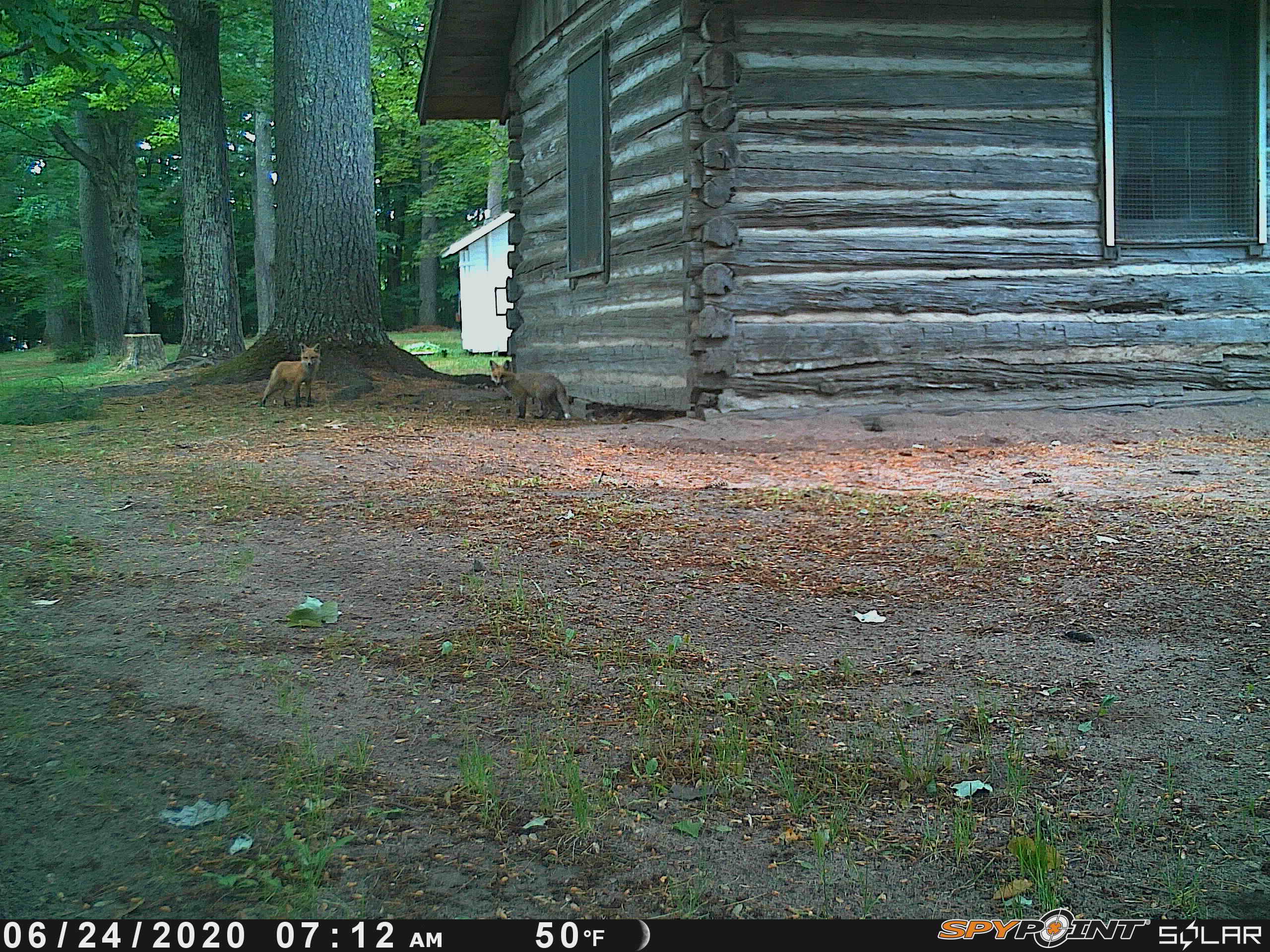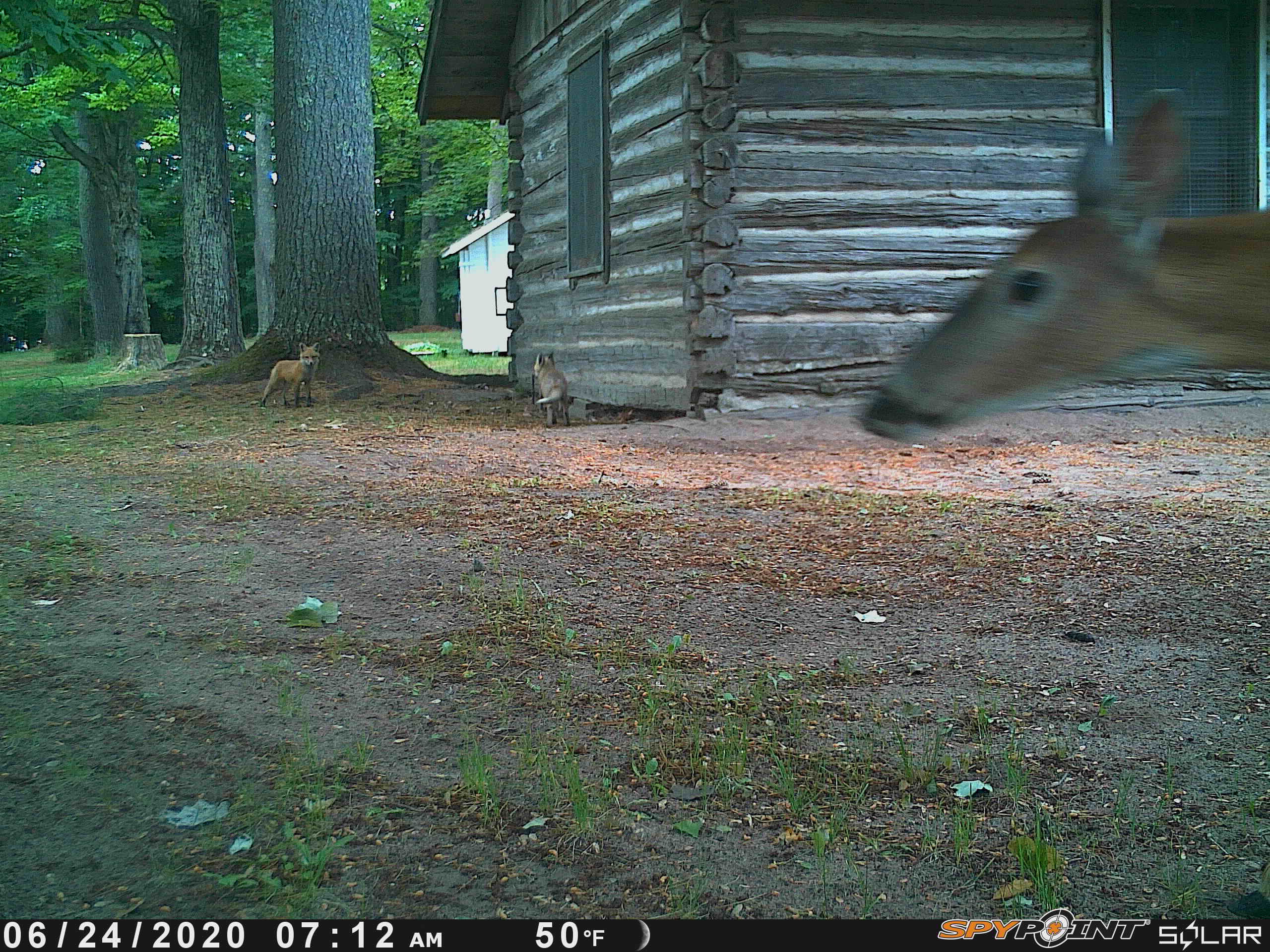 With camp quieter than it has been for more than 90 years, a new batch of campers have arrived. Our wildlife friends who usually make themselves scarce when you all are running around our 77 acres are really active. So, I set up my game camera (a motion activated, weather-proof camera) in some familiar spots to give you all a peek into who’s been exploring camp. Of particular note recently was the fox kits living with their parents under the Axemen Push Shack, and the multiple fawns walking around camp with their moms. While you kids aren’t at camp right now, we’re thrilled that some more wild kids are getting an opportunity to explore the grounds, and maybe even climb the wall!